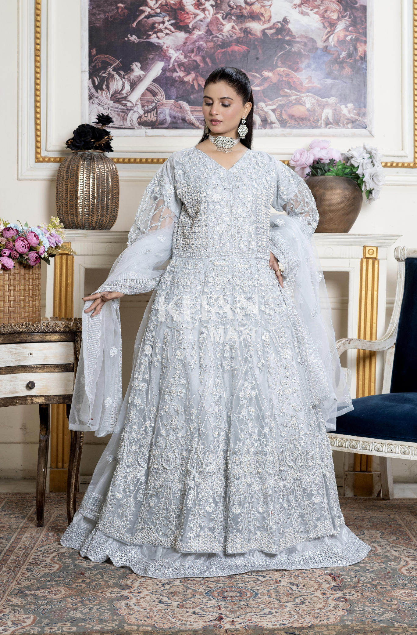 Step into timeless elegance with our Serene Silver Khan Maxi, a masterpiece that captures grace and sophistication. This stunning ensemble is meticulously adorned with hand-embroidered silver sequins, beads, and threadwork over a luxurious net fabric, creating a breathtaking shimmer with every move.