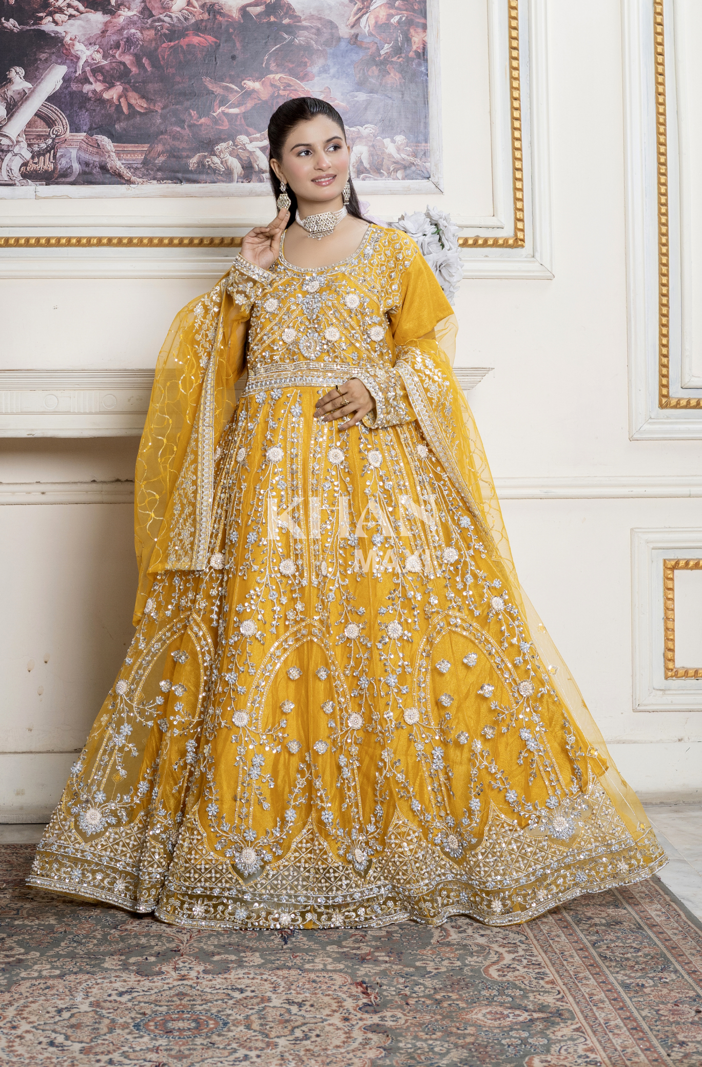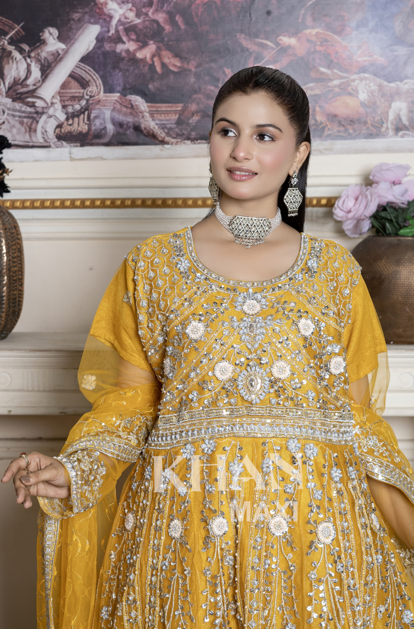Step into regal elegance with “Zariyah – The Golden Radiance”, a masterpiece that embodies timeless charm and modern grandeur. This exquisite mustard-golden maxi is adorned with intricate silver zari, dabka, and stone embellishments, creating a breathtaking symphony of sparkle and sophistication.